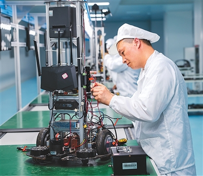 六月五日,在位于浙江省金华市金东区金义新区的浙江恒东智能科技有限公司机器人智造中心,工作人员在装配服务机器人。